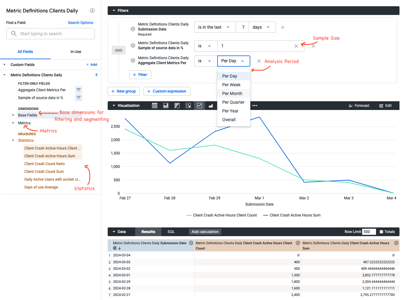 - Base Fields: This section contains dimensions that are useful for filtering or segmenting the population, like channel or operating system. These base fields can be configured in metric-hub (see below).
